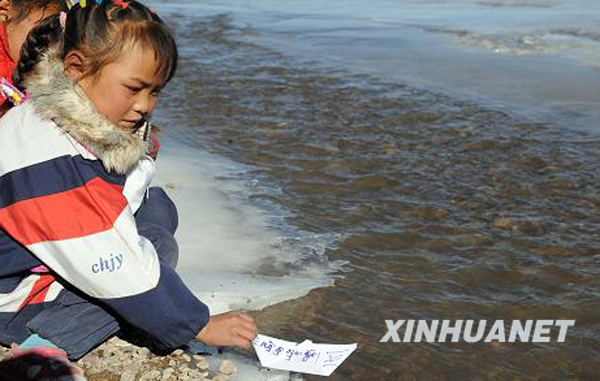在沱沱河畔,扎西巴毛拿著一只紙船放到河面飄流,紙船上她用藏文、漢文寫下了“保護長江”等內容的環保倡議(10月27日攝)。
