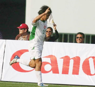 Du Zhenyu cheers for his goal for the north team. [China Foto Press]