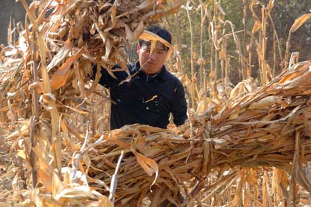 A farmer packs up scorched corn stalks on the field near Jinan, Shandong Province, November 16, 2006. The most severe drought in the past thirty years prevails in the eastern province, leaving two million people temporarily short of drinking water. |