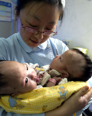 A nurse holds a pair of conjoined twins from Shangdong province in eastern China at a ward of a hospital in Shanghai April 5, 2007. The twins, born on January 30 this year, are joined at most parts of the liver and the lower part of the breastbone. They are waiting for surgery operations at the hospital. [Xinhua]