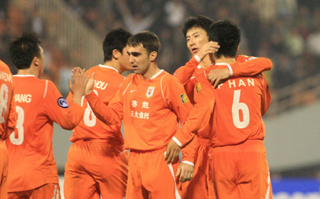 China's Shandong Luneng players celebrate a goal against Vietnam's Dong Tam Long An during their AFC Champions League game in Jinan, east China's Shandong Province April 11. Shandong trounced Long An 4-0 in its third winning streak, topping the Group G with 9 points.[Newsphoto]