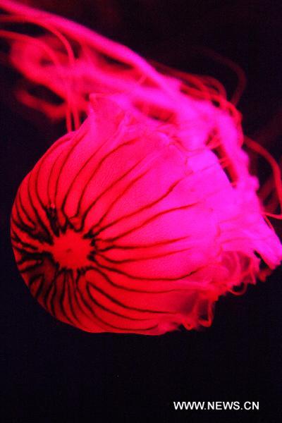 | A jellyfish floats through its basin at Qingdao Aquarium in Qingdao, east China's Shandong Province, May 15, 2011. The Aquarium presents four different species of jellyfish as of now. (Xinhua/Niu Shupei) |