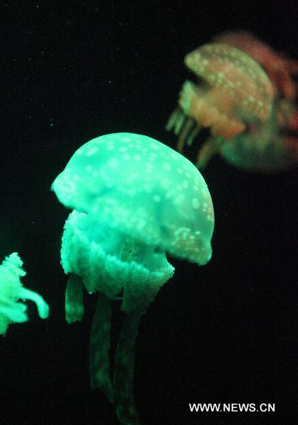 | Jellyfish float through their basin at Qingdao Aquarium in Qingdao, east China's Shandong Province, May 15, 2011. The Aquarium presents four different species of jellyfish as of now. (Xinhua/Niu Shupei) |