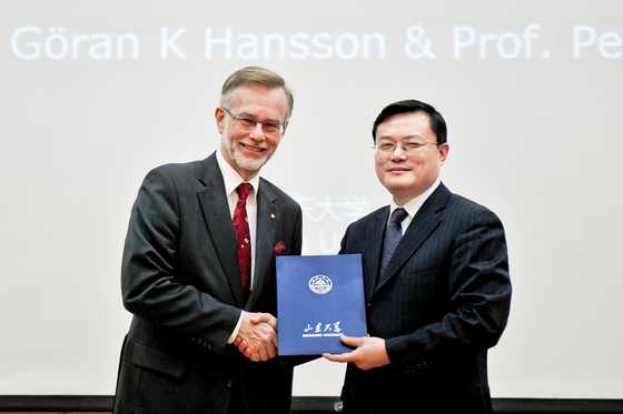 The Conferring Ceremonyfor Honorary Professorship of SDU was held in the Lecture Hall of the Complex Building, Baotuquan Campus, Shandong University on March 17th. Goran K Hansson, a Distinguished Professor at Karolinska Institute in Stockholm, Sweden, Secretary General of the Nobel Committee for Physiology or Medicine, and Peter Libby, a Professor of Medicine at Harvard University Medical School, Chief of Cardiovascular Medicine at Brigham and Women’s Hospital in Boston, Massachusetts, the U.S., were awarded Honorary Professorships by SDU President Zhang Rong.