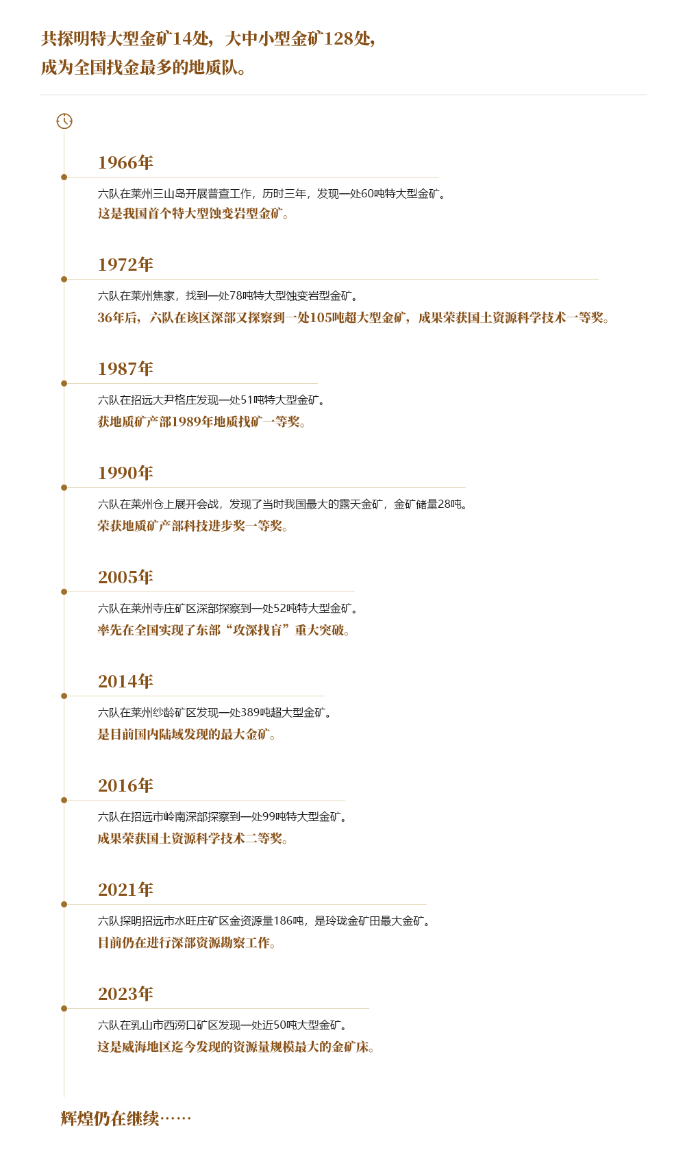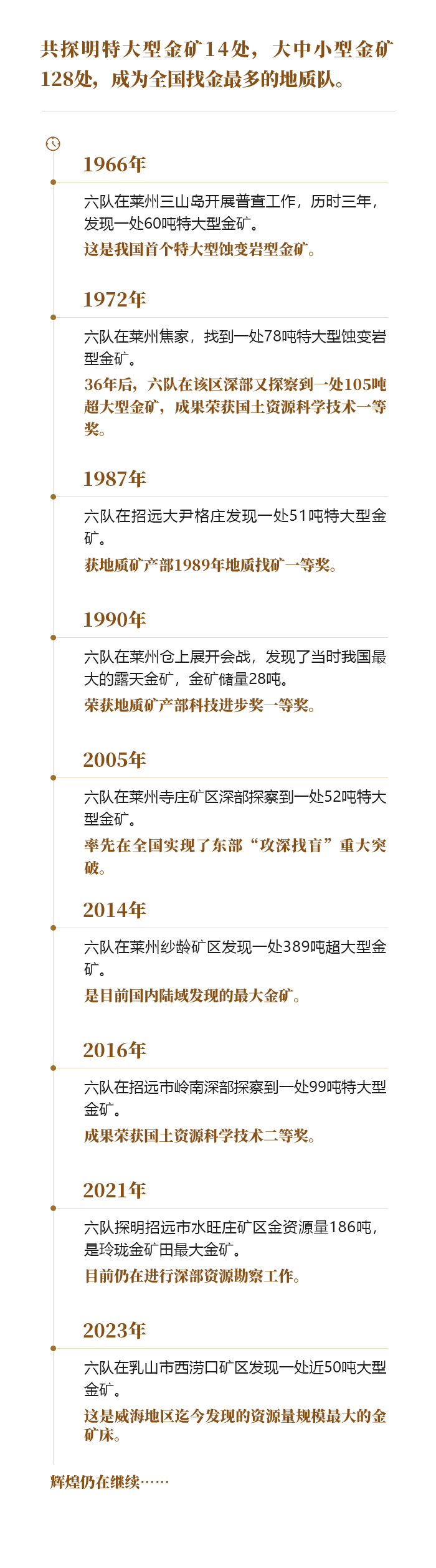 載譽奮進,在不到十年的時間里,六隊連續(xù)探獲了焦家深部、朱郭李家、紗嶺、西澇口、水旺莊等13個大型、特大型金礦。膠東地區(qū)一躍成為世界第三大金礦富集區(qū),六隊創(chuàng)造了黃金找礦新輝煌,有力支撐了我國黃金戰(zhàn)略儲備。