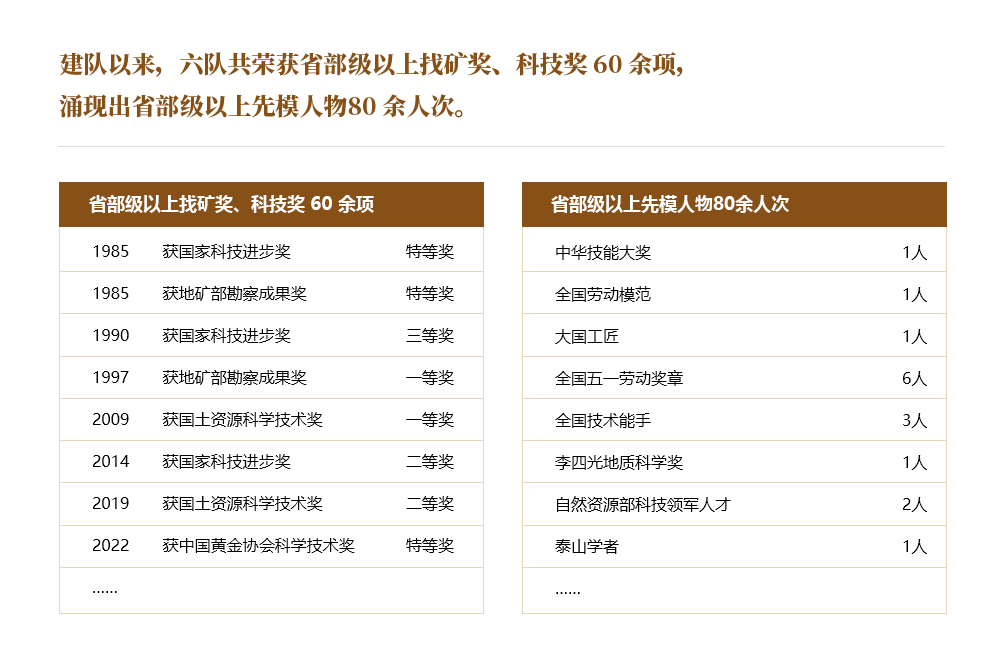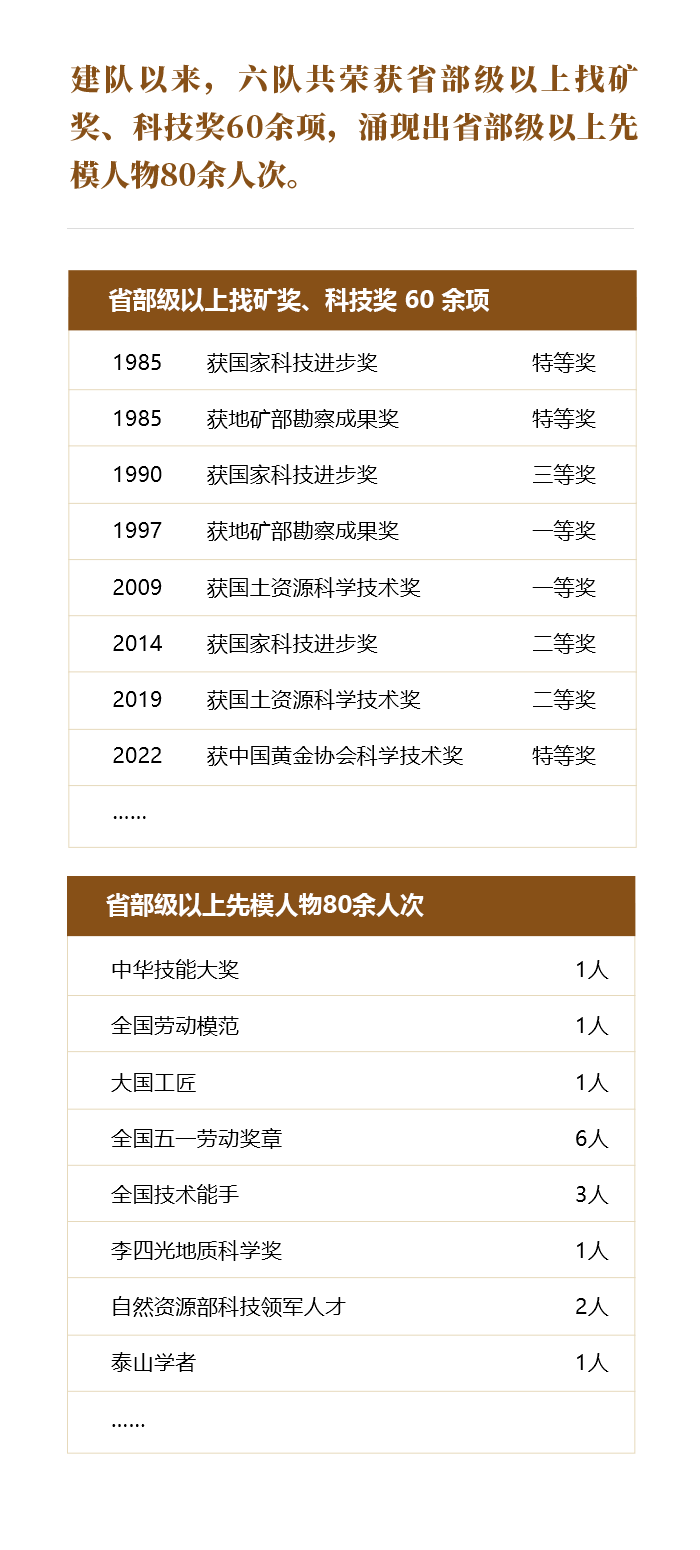 1985年,六隊創(chuàng)立的《焦家式新類型金礦的發(fā)現(xiàn)及其突出的找礦效果》,與“兩彈一星”同獲首屆國家科技進步獎特等獎。1992年,六隊獲得國務(wù)院授予的“功勛卓著無私奉獻的英雄地質(zhì)隊”榮譽稱號,成為全國地礦系統(tǒng)迄今唯一獲此殊榮的單位。
