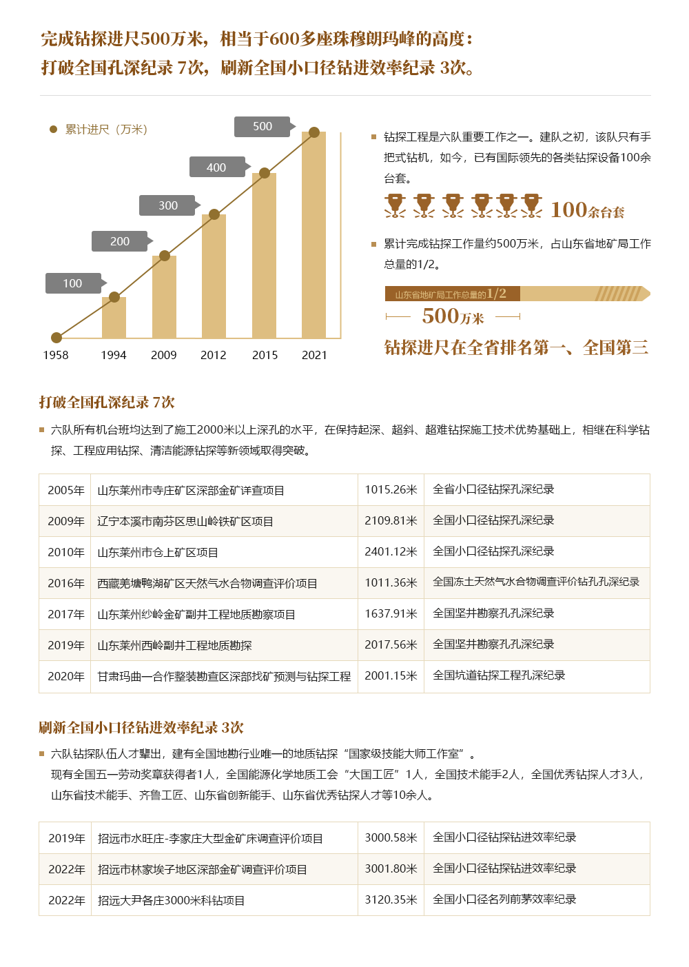 2022年2月,“山東省招遠市水旺莊礦區(qū)金礦勘探”項目入選中國地質(zhì)學(xué)會2021年度十大地質(zhì)找礦成果,標志著我國第三條千噸級控礦斷裂帶——招平斷裂帶誕生。2022年6月,六隊在大尹格莊金礦鉆探出3120.35米的深度,這是他們?nèi)陜?nèi)第三次刷新全國小口徑鉆探同類型鉆孔鉆進效率紀錄。