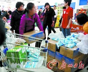 [提要]   “我家附近的超市已經(jīng)沒鹽了,一些人都整箱地購買食鹽。”昨天本報(bào)接到了廣東多個城市的讀者打來電話,反映食鹽遭搶購。個別商家也趁機(jī)提價,一包鹽賣到10多塊錢。記者立馬趕往超市,正好遇到市民搶鹽,連平日里無人問津的澳洲進(jìn)口鹽都搶光了。