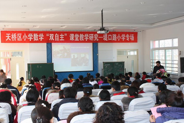 1月6日下午,全區小學數學‘雙自主’課堂教學研究在堤口路小學舉行。副局長張萍、濟南師范附屬小學校長馬剛以及全區小學數學教師共近120人參加了此次活動。