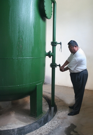 圖3:工作人員定期清理水處理罐。通過(guò)離心泵將蓄水池的水送到水處理罐,進(jìn)行除鐵、錳、雜質(zhì)、殺菌等工序,最后將達(dá)標(biāo)水通過(guò)供水主管道輸送到農(nóng)戶家中。