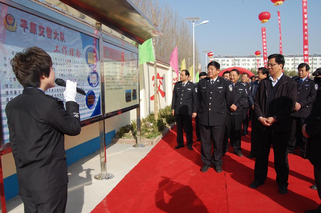啟用儀式由大隊長黃景波主持;縣委副書記楊杰做賀詞;最后由交警支隊宣布平原大隊新車管所正式啟用。啟用儀式結束后,與會代表在大隊長黃景波的陪同下,視察了新車管所服務大廳,并現場檢查指導業務辦理情況。