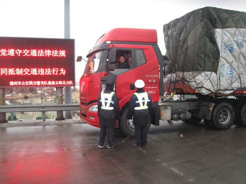 據(jù)了解,該大隊在青銀高速夏津收費站布置警力,采取間隔放行的措施,對進入高速公路的車輛進行管控,并通過口頭提示的方式,做好路況告知、安全提示工作;在青銀高速魯冀檢查站大隊民警對過境車輛進行宣傳,提醒駕駛人因路面濕滑、能見度低等原因,要注意控制車速、保持安全車距,保證雪天行車安全;巡邏中隊,加大了轄區(qū)巡邏頻次,亮起警燈、拉響警笛,通過警車壓速行駛、警車帶道等多種措施,引導車輛緩慢通行,在做好信息協(xié)調(diào)、保證主線通行安全的前提下,盡量避免車輛滯留。該大隊還聯(lián)系高速路政部門在轄區(qū)跨路電子屏上循環(huán)播放“雪天路滑,注意安全”、“雪天路滑,保持安全車距”、“雪天路滑,請就近駛離高速公路”等警示標語,提醒駕駛人注意行車安全。