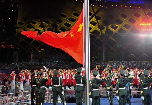 8月12日,第26屆世界大學生夏季運動會開幕式在深圳舉行。這是在開幕式上升中華人民共和國國旗。新華社記者 梁旭 攝