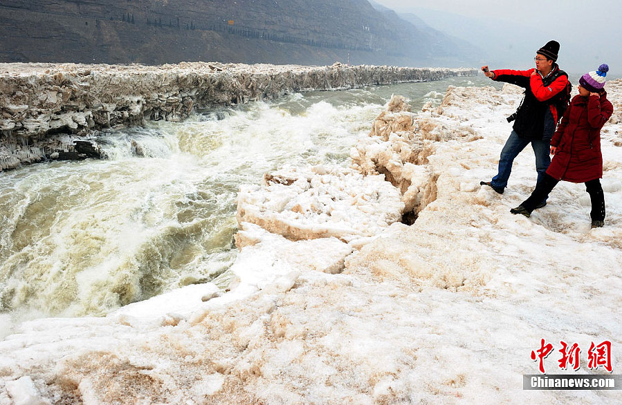 2月12日,來自西安游客站在吉縣一側黃河壺口冰封撕裂層面上拍照留念。近日,隨著氣溫的回升,封凍月余的黃河壺口瀑布開始消融,形成一條30多米長、10多米寬的壺槽,給初春的壺口瀑布帶來勃勃生機。中新社發袁景智 攝 圖片來源