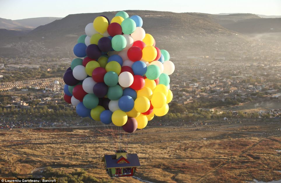 【環(huán)球網(wǎng)綜合報(bào)道】 據(jù)英國《每日郵報(bào)》11月19日消息,18日在墨西哥舉行的利昂國際氣球節(jié)上,美國一名男子使用氣球?qū)⒁蛔∥萆咸炜眨训纤鼓釀?dòng)畫電影《飛屋環(huán)游記》中的精彩畫面變成現(xiàn)實(shí)。
