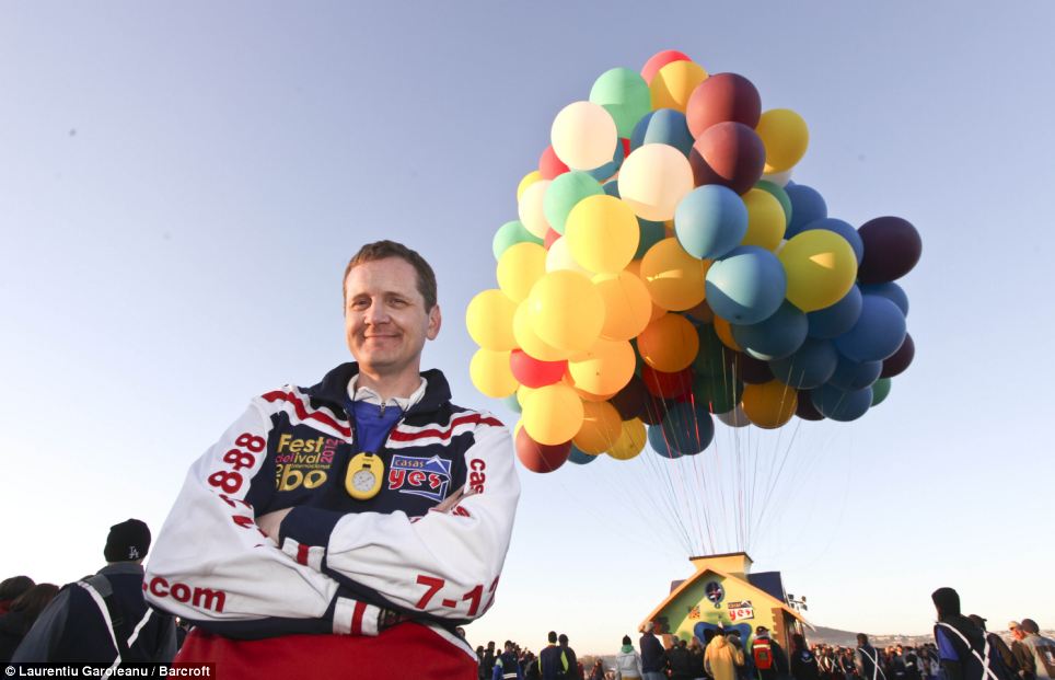 這名叫喬納森(Jonathan Trappe)的38歲男子來自美國北卡羅來納州羅利市,曾是世界上第一位駕駛氣球飛越英吉利海峽的人。而此次“飛屋”表演只是喬納森的熱身活動(dòng),他計(jì)劃于2013年夏天駕駛氣球從美國緬因州出發(fā),飛越大西洋到達(dá)法國巴黎,全程長達(dá)2500英里(約4023公里),飛行高度將達(dá)到18000英尺至25000英尺(約5486米至7620米)。喬納森為此已投入17萬美元(約合人民幣106萬元),屆時(shí)他將使用365個(gè)巨型氦氣球把一艘7英尺長(約2.1米)的救生船送上高空,以防在大西洋上空飛行時(shí)遇險(xiǎn)而緊急迫降。