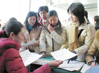 1月6日,求職人員在山東省濟南市人才交流中心登記有關(guān)資料。在山東省濟南市人才交流中心,工作人員將求職人員資料輸入專門的網(wǎng)絡(luò)系統(tǒng),使求職人員的信息在省內(nèi)各人才交流中心實現(xiàn)共享。山東省人事、公安、勞動保障等各部門圍繞著促進就業(yè)再就業(yè)工作多管齊下、密切協(xié)作,出臺了一系列相關(guān)政策和服務(wù)措施。2003年,山東省城鎮(zhèn)實現(xiàn)就業(yè)和再就業(yè)105萬人,其中下崗失業(yè)人員再就業(yè)36萬人,困難群體再就業(yè)7.5萬人。