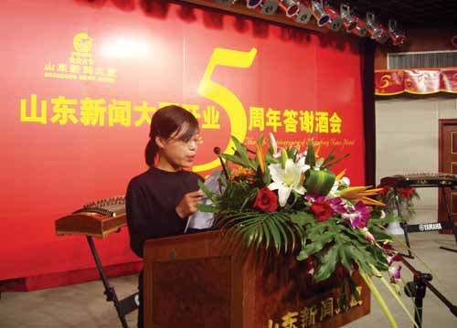 右圖:為使五周年慶典更有意義,新聞大廈全體員工捐款1萬元,用于資助山東大學(xué)和山東經(jīng)濟(jì)學(xué)院的5名大一特困生,并在當(dāng)天舉辦的答謝酒會上舉行了捐助儀式,接受資助的大學(xué)生代表上臺發(fā)言,表達(dá)衷心的謝意。