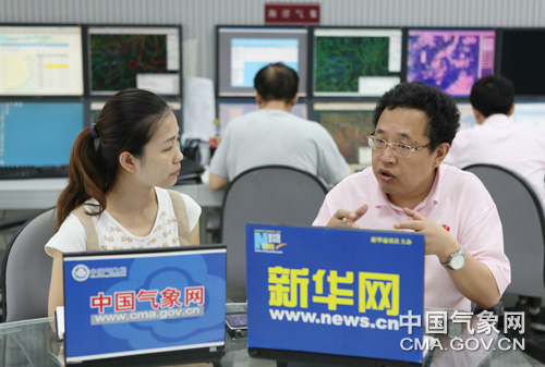 圖為臺風與海洋氣象預報中心高級工程師高拴柱(右一)接受記者采訪。莊白羽攝影
