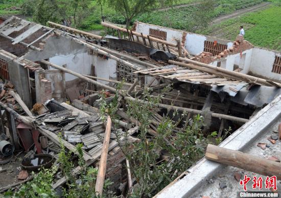 8月9日17時15分左右,一場龍卷風襲擊了江蘇姜堰市蔣垛鎮的界河、興港、蔣垛等8個村,造成了三百多間房屋損毀,四百多頭牲畜死亡,一百多戶農戶受災,所幸未造成重大人員傷亡。中新社發 周勝濤 攝