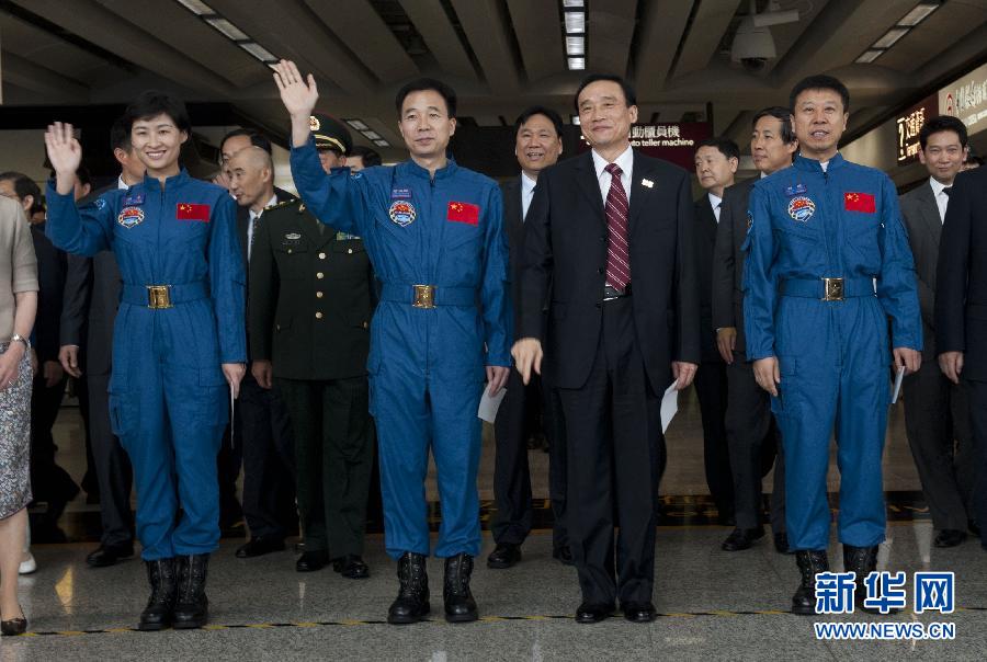 8月10日,航天員景海鵬(前右三)、劉旺(前右一)、劉洋(前左一)等代表團(tuán)成員抵達(dá)香港國(guó)際機(jī)場(chǎng)。當(dāng)日,天宮一號(hào)與神舟九號(hào)載人交會(huì)對(duì)接任務(wù)代表團(tuán)抵達(dá)香港,開始為期4天的訪問。 新華社記者呂小煒攝