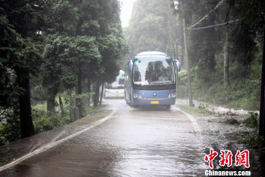 廬山南山公路路面積水,汽車緩慢前行。黃水林攝