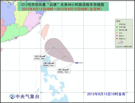 據監測,今年第13號熱帶風暴“啟德”(KAI-TAK,名字來源:中國香港,名字意義:香港舊機場名)于8月13日08時在臺灣鵝鑾鼻東南方約920公里的西北太平洋洋面上生成,就是北緯16.9度,東經127.8度,中心附近最大風力有8級(18米/秒),中心最低氣壓為998百帕。