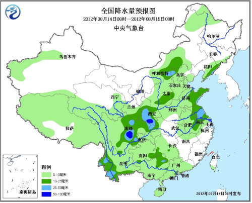 14日08時至15日08時,青藏高原、新疆西南部、西北地區東部、內蒙古中部和東北部、東北地區南部、華北、黃淮、江淮、西南地區、江南西部、華南等地有小到中雨或雷陣雨,其中,陜西南部、四川盆地西部、重慶北部、內蒙古中部、河北西北部、遼寧東部、山東東南部、江蘇中部、云南西部和南部等地的部分地區有大雨,局地暴雨(50~90毫米),上述部分地區并伴有雷暴大風等強對流天氣。