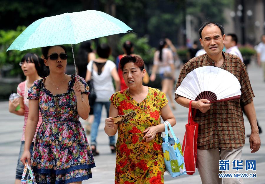 8月13日,幾位市民冒著高溫在解放碑逛街。連日來,素有“火爐”之稱的重慶市遭遇持續(xù)高溫天氣,最高氣溫維持在35℃以上。重慶市氣象臺(tái)于13日11時(shí)50分再次發(fā)布“高溫紅色預(yù)警”信號(hào)。這也是繼12日后,重慶今年第二次發(fā)布高溫紅色預(yù)警。預(yù)計(jì)今天12時(shí)到18時(shí),該市潼南、渝北等地日最高氣溫將升至37℃以上,南岸、九龍坡、大渡口等地日最高氣溫將升至40℃以上。新華社記者 李健 攝