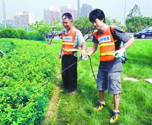 [提要] 在張師傅的指導下,我左手按壓著藥箱的把手,右手拿著的噴頭里便均勻地噴出了蟲藥。在橋區的另一塊綠地上,劉金堂師傅正在給草坪灑水,清澈的自來水從水管口噴出,在空中劃過一個漂亮的扇形。