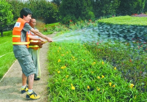 在橋區的另一塊綠地上,劉金堂師傅正在給草坪灑水,清澈的自來水從水管口噴出,在空中劃過一個漂亮的扇形!澳屛乙苍囋嚕 蔽疫@么一說,劉師傅便將手里的水管塞給了我。學著劉師傅的樣子,我卻發現自己無論如何也灑不出一個扇形,比劃了半天,只見一道水柱噴在了綠地里,而且噴灑的距離還不足一米。莫非劉師傅手里還有什么工具沒有交給我?看著我疑惑的表情,劉師傅說,這學問都在大拇指上。說著,劉師傅又給我示范了一遍,我這才發現,用大拇指堵住一部分管口,增大了水壓,水才能噴得更遠。第二次嘗試時,我把拇指堵在了管口中央,水柱一下子散成了一朵大花,不只是我,就連在旁邊干活的幾位師傅身上也濺了一身的水。