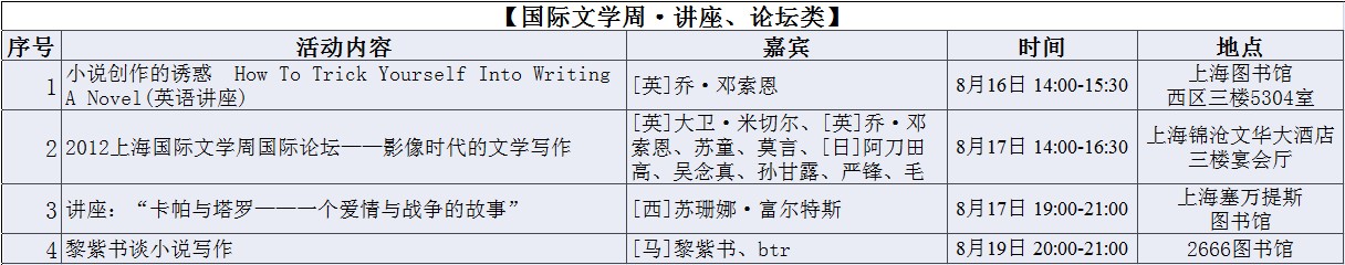 2011年,上海書展在全國首次創立“國際文學周”單元,由書展主辦方、媒體、出版機構等共同邀請國際作家到上海來與讀者交流,這一系列文化活動在書展中得到讀者的認同。今年“上海國際文學周”的主題是“影像時代的文學寫作”,邀請了19位海內外作家和譯者,安排24場活動,形式包括對話、演講、簽售、朗誦等。[更多]