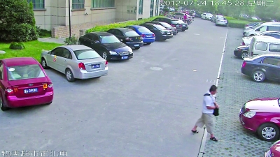 一綁匪向預(yù)謀劫持的紅色轎車走去。(監(jiān)控視頻截圖,警方提供)