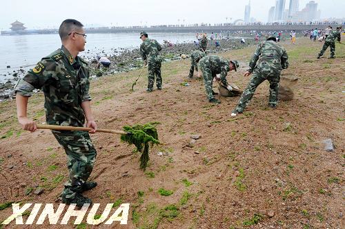 7月7日,青島市南公安邊防大隊(duì)官兵在棧橋景區(qū)海灘上清理滸苔。