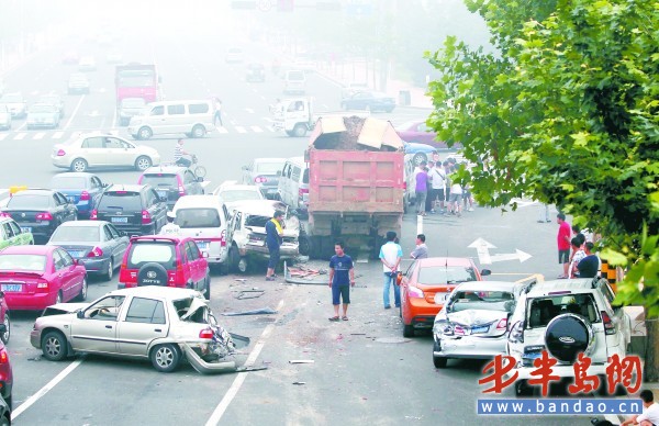 青島一自卸車失控連撞14車