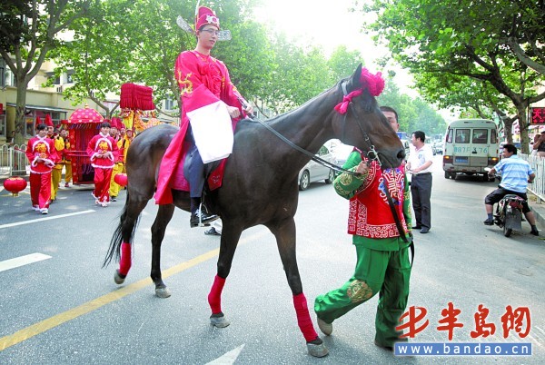 [提要] 7月16日上午,在臺湛路舉行了一場別開生面的復古婚禮,新郎騎馬當先,新娘坐轎在后,熱熱鬧鬧的婚禮吸引了眾多市民的關注。據了解,馬是從一家馬術俱樂部租來的,為了騎好馬,新郎婚禮前還經過專門培訓。業內人士認為,這種婚禮符合當前低碳環保的生活方式。