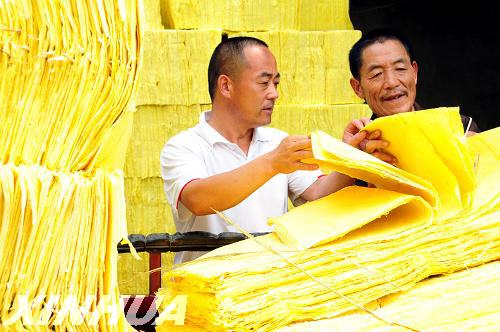 7月21日,山東省郯城縣馬頭鎮石站村60歲的草紙匠人孫永正(右)向客商介紹用土法制造的草紙。
