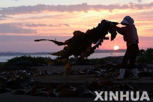7月21日,在山東榮成沿海的一處海帶晾曬場(chǎng)上,一名女工迎著日出晾曬海帶。(王福東 攝)