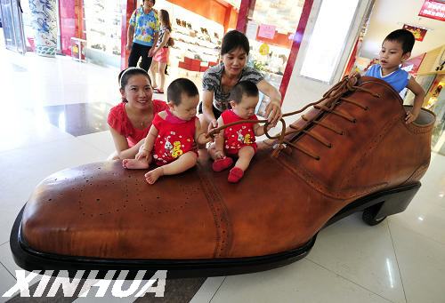 8月16日,在濟南一家鞋城內,孩子們在一輛“鞋車”上玩耍。