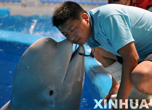 8月16日,一頭白鯨在“親吻”飼養(yǎng)員。新華社記者 朱崢 攝