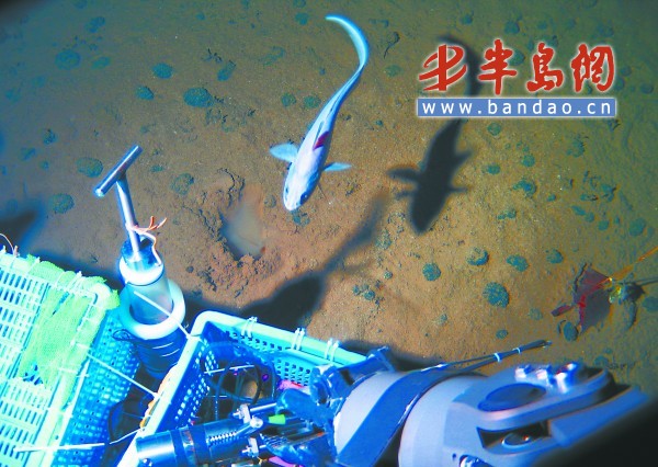 8月23日,完成載人深潛5000米級海試的"蛟龍號"試驗母船"向陽紅09"船回到青島。圖為5000米深海拍攝到的鼠尾魚,黑色石頭是被稱為"不會發光的黃金"的錳結核。 通訊員 王文勝 供圖