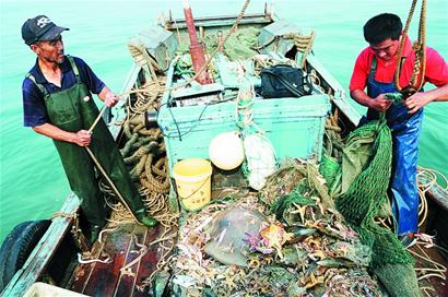 “這些個頭很大的都是沙海蜇,比起綿海蜇來口感差一些,也賣不上好價錢,也就1塊錢1斤吧!毖馍秸f,今年的沙海蜇真是不少,如果單純捕撈沙海蜇的話,一天也能賣個1000來塊,可是拖網捕魚的時候,沙海蜇鉆進網里就不是好事了,它會將網托起,這樣就不能將海底的東西都撈上來,影響捕撈的效果。