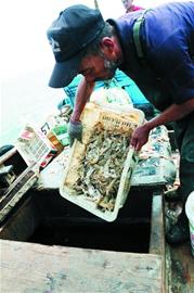 “要返航了,碼頭上的魚販子已經等著了。”到了下午4時,薛光山吆喝著,也加快了分揀海貨的速度。隨后他駕船回到甘水灣碼頭。記者看到岸上走來一個穿白衣的男子!袄涎,今天有什么好東西?”“有活立蝦、雜魚、蝦虎……”兩人互相吆喝著。