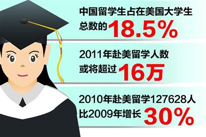 據美國國際教育協會日前發布的報告,2010年來自中國大陸的赴美留學生人數高達127628人,與上一年相比激增了30%;2011年,赴美簽證人數步步高漲,或將超過16萬人。目前,來自中國的留學生在美國各大院校在冊學生總數中所占的比例已經高達18.5%,幾乎每5名在校留學生中,就有一名來自中國。