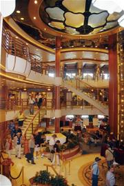 步入鉆石公主號郵輪大廳,足足有4層樓高的中庭金碧輝煌。據了解,船上共有客艙1337間,其中有748間設有私人露臺。船上共有5個主題餐廳,可為游客提供歐美及亞洲風味的各式菜肴。還有一個可容納700多人的公主劇院以及各式酒吧、夜總會、網吧、電影院等。豪華游輪共18層,其中1-3層是工作人員的工作區,4層是服務總臺,6層是免稅店、酒吧,14-16層是運動區。最受歡迎的自然就是運動區域,一排排運動器材緊靠著船上的大窗,運動的同時可直接透過船艙俯瞰海中美景。里面有各種鍛煉所需的健身器材,還有專門的瑜伽課和健身課。