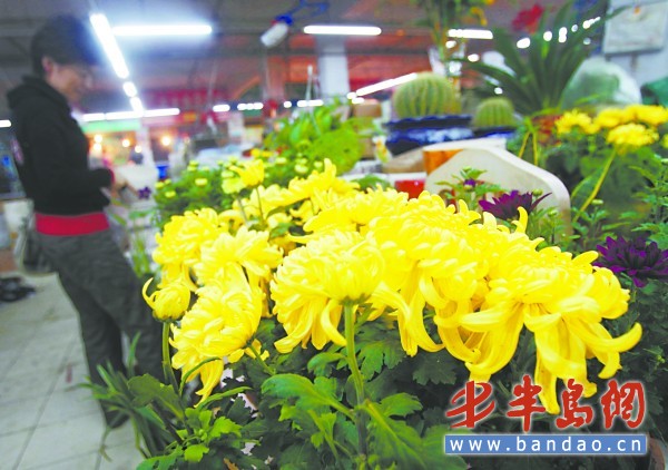 [提要] 10月10日,新田路一市場內,業戶擺放的菊花吸引了不少路人的目光。據了解,盆栽菊花已經上市一周,今年菊花每盆價格15元左右,比去年同期貴了5元錢,漲價的原因是運輸 、人工成本提高 。記者 何毅 (來源:半島網-半島都市報)