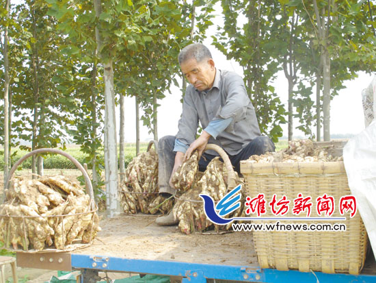 山東省昌邑市都昌街道中伍塔村劉昆明的姑父將新姜裝筐。