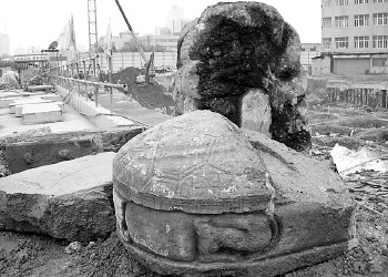 “這些殘碑都是施工人員從迎祥宮碑西側(cè)50米的一個地方挖出來的,其中碑首高約1.6米,寬約1.2米,還有盤龍。這么高大和高規(guī)格的古代碑首在濟(jì)南很少見。”濟(jì)南市考古研究所考古科郭科長介紹說,初步推算,原來整個碑刻有個有六七米高。由于現(xiàn)在還沒有看到碑文,還不好斷定碑刻的具體年代。但根據(jù)石碑出土的位置分析,有可能和迎祥宮碑或以前的舜廟有關(guān)。郭科長說,出土石碑的地方屬于濟(jì)南地下文物保護(hù)區(qū),他們打算繼續(xù)考古發(fā)掘,正在和建設(shè)方進(jìn)行積極協(xié)調(diào)。