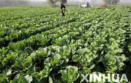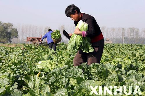 11月13日,山東省棗莊市嶧城區(qū)大橋村農(nóng)民在菜地里采收大白菜。 (孫中喆 攝)