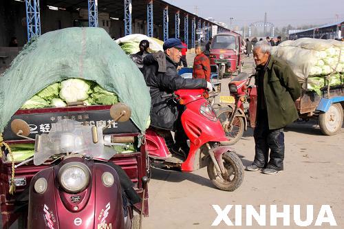11月13日,在棗莊市嶧城區(qū)大橋蔬菜批發(fā)市場(chǎng),農(nóng)民運(yùn)來(lái)一車(chē)車(chē)白菜等待買(mǎi)家。(孫中喆 攝)